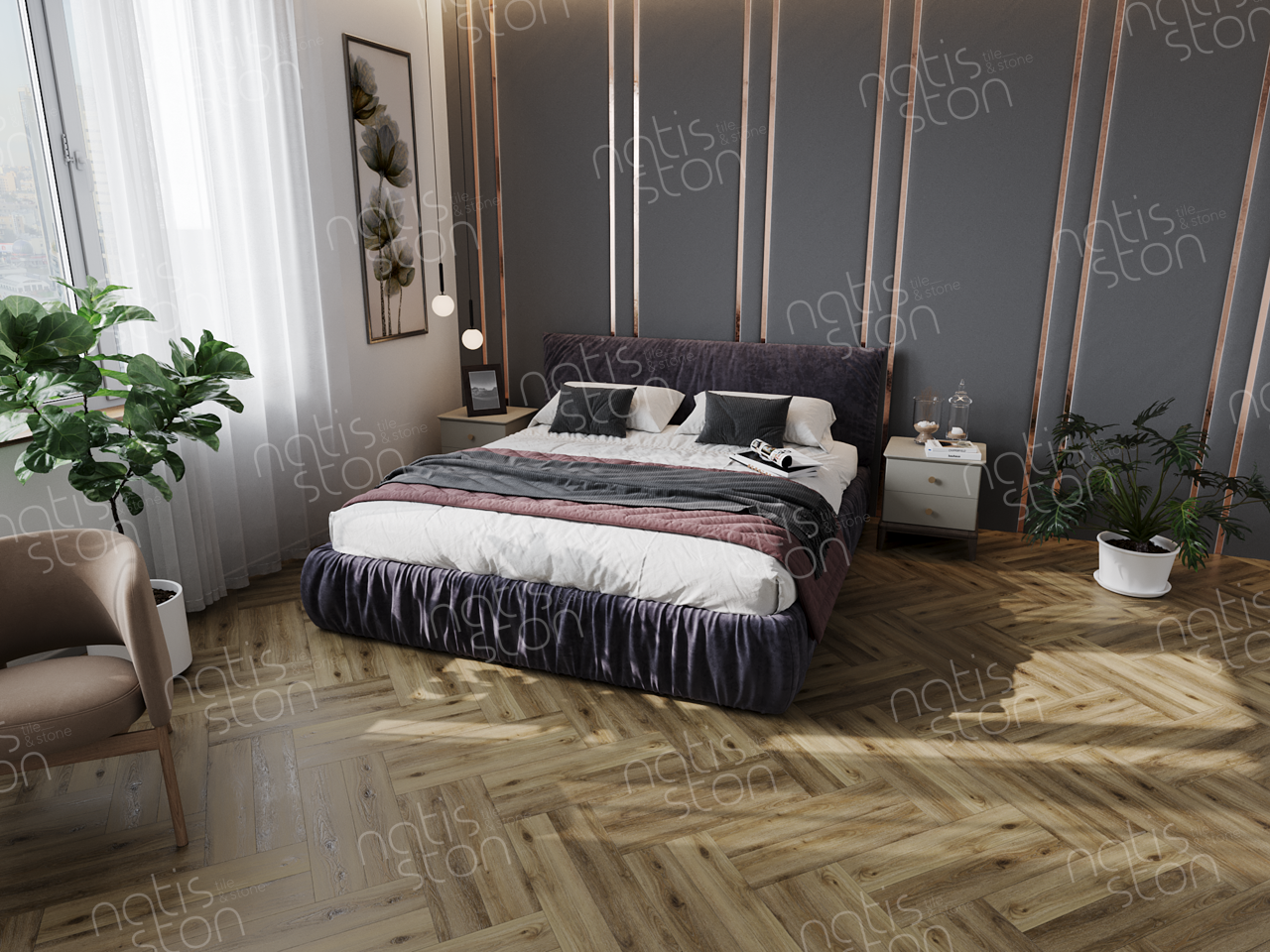 Natisston SPC - полностью водонепроницаемое* модульное покрытие с замковой системой соединения – «плавающий пол», с отличными акустическими и тепловыми свойствами. Это покрытие является прочным и жестким из-за большого содержания (более 70%) каменной крошки в составе.