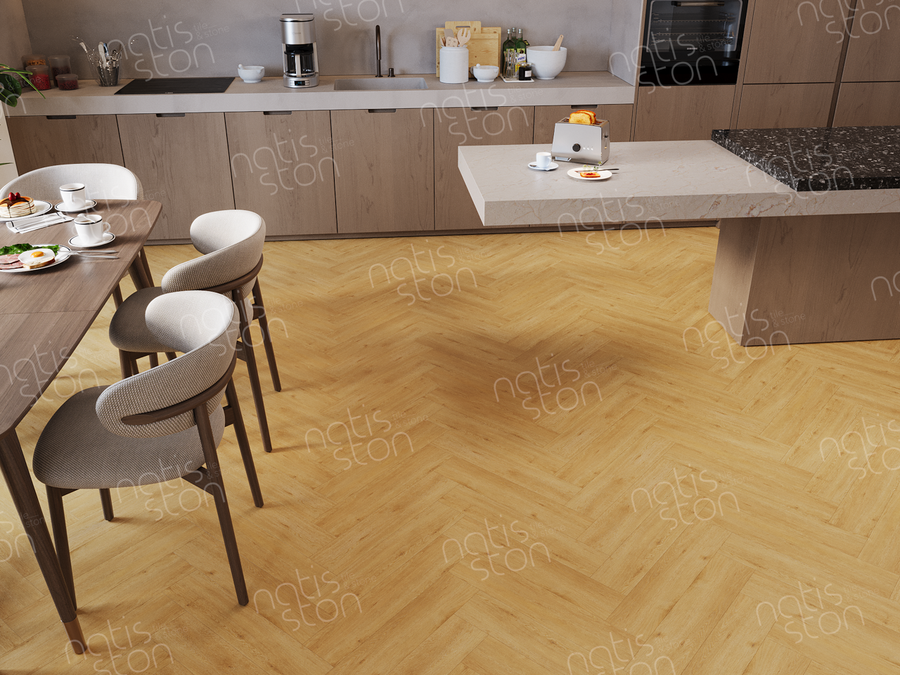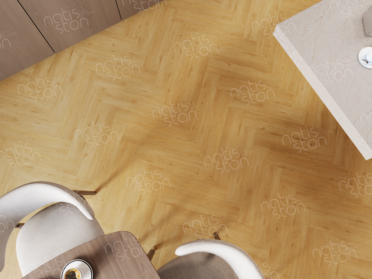 Natisston SPC - полностью водонепроницаемое* модульное покрытие с замковой системой соединения – «плавающий пол», с отличными акустическими и тепловыми свойствами. Это покрытие является прочным и жестким из-за большого содержания (более 70%) каменной крошки в составе.